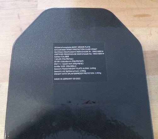 | Bezeichnung: | Plattenträger (cytac.com) in grün (OD) und Stahl-Platten Schutzklasse VPAM7 (bis .308 Win. Distanz 5m), Abm. 25x30cm, Gewicht je Platte 2,9KG, Vorderseite (SF=Strike Face) mit 3mm PU-Beschichtung als Splitterschutz, Rückseite ist mit 1mm PU beschichtet. | ||||||||