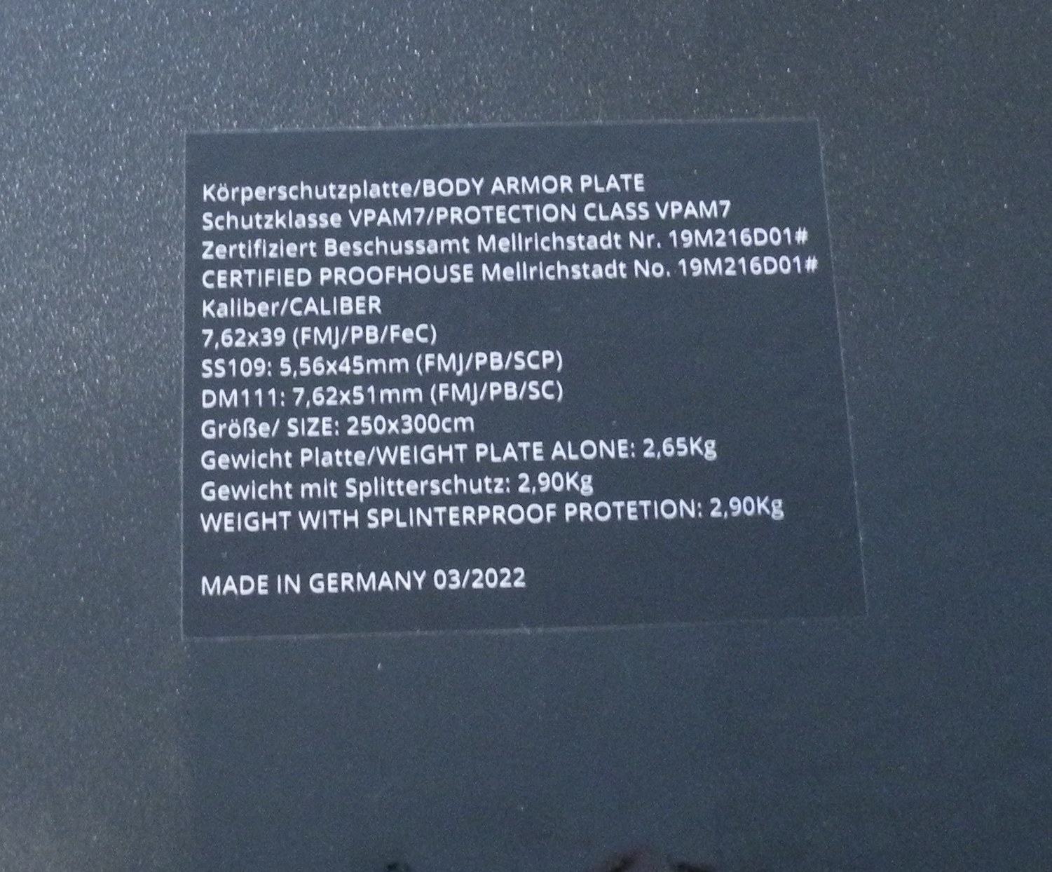 | Zertifiziert vom Beschussamt Mellrichstadt. Es wird ausschließlich Stahl, aus dem getestet Lot verarbeitet. Alle ballistischen Schutzplatten sind MADE IN GERMANY. Es handelt sich um sogen. Stand Alone Platten, es wird keine zusätzlich Weichballistik hinter den Platten benötigt! Set Gewicht: 8,000 KG (Träger und 2 Platten), Gewicht einer einzelnen Platte nur 2,900 KG! Der Plattenträger in grün ist ein cytac.com Mod. TPCL Mission-oriented Plate Carrier | |||||||||